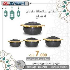 طقم حافظة طعام 3 قطع ، طقم حافظة طعام 4 قطع ، تمر مزارع الخير ، بصل يمني وسط ، طماطم فيلن جامبو ، كرتون خيار ، كرتون حار كويتي ، بطاطا فلين كبير كويتي ، طقم الصباحية ، مطارة ماء ستيل ، غوري الوان