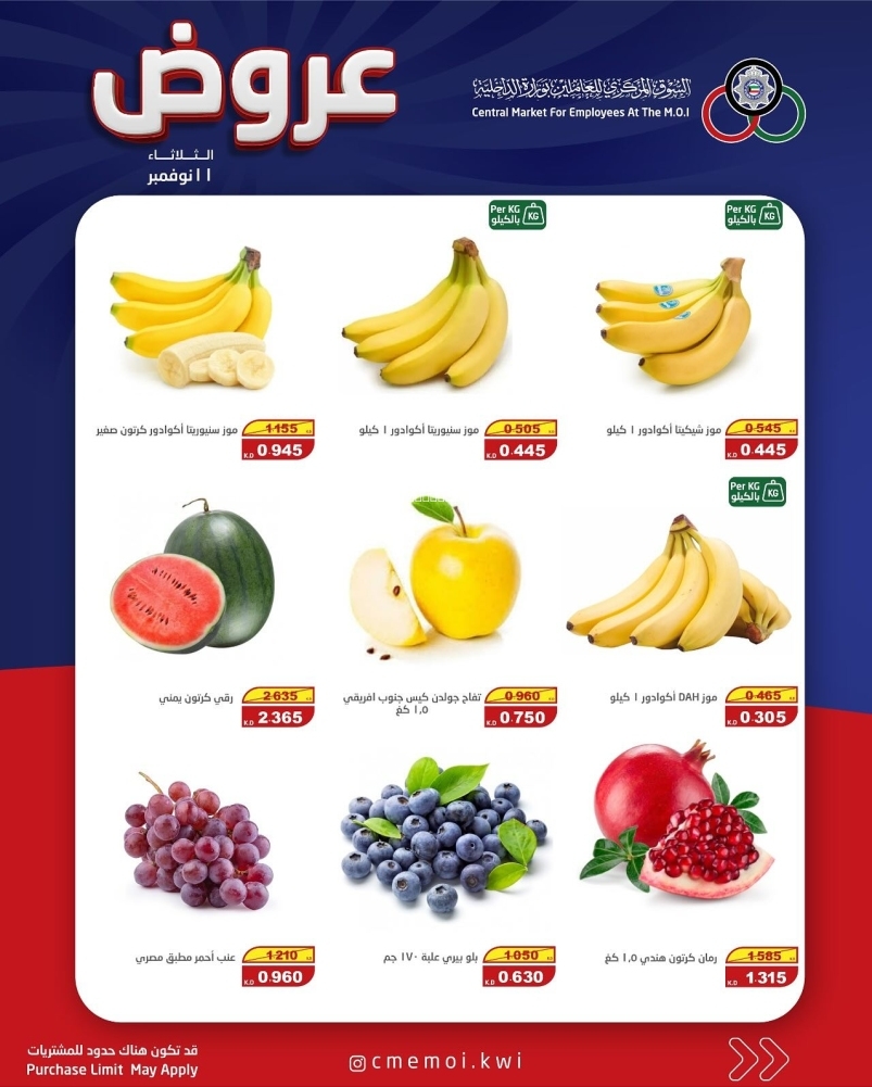 عروض السوق المركزي للعاملين بوزارة الداخلية اليوم 11 نوفمبر 2025 الموافق 20 جمادى الاول 1447 عروض الخضار و الفواكه . تابعوا أحدث عروض السعودية المتوفرة في جميع المتاجر و الهايبرات بأسعار منافسة 11-11-2025 الموافق 20-5-1447 عروض السوق المركزي للعاملين بوزارة الداخلية اليوم : تتضمن تخفيضات السوق المركزي للعاملين بوزارة الداخلية زبدة غير مملح يوني جولد وزن . و ايضا كذلك زيتون أخضر مغربي بالليمون طيبات العلا وزن . لا ننسى ايضا كذلك الشاي الأخضر وادي النحل ٣٠ كيس . و يوجد هنا كذلك مربى التوت الشامي شهد بالكيلو غرام . كما و لدينا ايضا كذلك لبنة بالزيت مع الزعتر شيف انتصار وزن . و لا تنسوا ايضا كذلك أصابع السمك ٣٠٠ غرام + ٥٠ غرام مجانا . كذلك المزيد من العروض و المفاجات في كل أسبوع . عروض السوق المركزي للعاملين بوزارة الداخلية لهذا الأسبوع: و مما تقدمه لكم أيضاً عروض اليوم من عروض ينسون وادي النحل ٣٠ كيس . و ايضا كذلك سكر ستيفيا ١٠٠ ظرف النحلة ٢٥٠ غرام . لا ننسى ايضا كذلك مكعبات سكر كبيرة فاخرة النحلة ١ كيلو غرام . و يوجد هنا كذلك كركديه وادي النحلة ٣٠ كيس . كما و لدينا ايضا كذلك جبنة تشدر مطبوخة علب كرافت ٦ × ١٠٠ غرام عرض خاص . و لا تنسوا ايضا كذلك زبدة الفول السوداني الناعمة بيب ١ كيلو جرام . واليكم الصور الآتية على موقع عروض الكويت