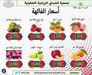 عروض جمعية العبدلي الزراعية التعاونية الكويت 11/7/2020 الموافق 20 ذو القعدة 1441 عروض يوم السبت مجموعة من الفواكه الطازجة ( خوخ عكاز ، مشمش ، كرز لبناني ، عنب مشكل هندي ، افندي ، نكتارين ، كوجا لبناني ، عرموط )