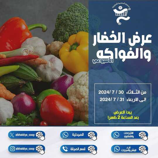 عروض جمعية الخالدية التعاونية اليوم 30 يوليو 2024 الموافق 24 محرم 1446 عروض الخضار و الفواكه بصفحة واحدة. تابعوا أحدث عروض اليوم 30-7-2024 الموافق 24-1-1446