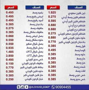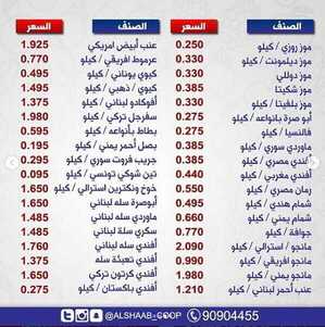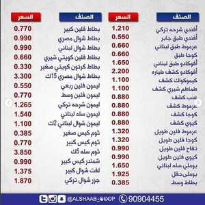 تين ، طماطم ، طماطم فلين وسط اردني ، طماطم فلين كبير اردني ، طماطم درج كويتي ، طماطم درج اردني ، حلوة ملون كويتي ، باذنجان كرتون ، فول وسط ، كوسا ، حار وسط ، حلوة وسط ، خس عربي وسط ، خس مدور وسط ، بامية وسط ، اسود رفيع وسط ، باذنجان ، ملفوف مشكل وسط ، بصل شوال وسط ، بصل شوال صغير