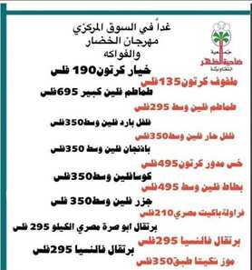 خيار كرتون ، ملفوف فلين وسط ، طماطم فلين كبير ، فلفل بارد فلين وسط ، باذنجان فلين وسط ، كوسا فلين وسط ، جزر فلين وسط ، برتقال ابو صرة مصري ، برتقال فالنسيا ، موز شكيتا طبق ، فراولة باكيت مصري ، بطاطا فلين وسط ، خس مدور كرتون ، فلفل حار فلين وسط
