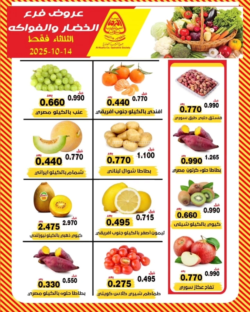عروض جمعية النزهة التعاونية اليوم 14 أكتوبر 2025 الموافق 21 ربيع الاخر 1447 عروض الخضار و الفواكه . تابعوا أحدث عروض السعودية المتوفرة في جميع المتاجر و الهايبرات بأسعار منافسة 14-10-2025 الموافق 21-4-1447 عروض جمعية النزهة التعاونية اليوم : تتضمن تخفيضات جمعية النزهة التعاونية الوادي سمبوسة لحم ٢٤٠ غرام . و ايضا كذلك لحم بقري مفروم سوبر ٣٥٠ غرام . لا ننسى ايضا كذلك سيرا دجاج ١ كيلو جرام . و يوجد هنا كذلك كيرالا تابيوكا طازجة مجمدة ٢ حبة ٧٥٠ غرام . كما و لدينا ايضا كذلك يمامه سايجانا كاشور لاتي ٣٠٠ غرام . و لا تنسوا ايضا كذلك بطاطس المزرعة اوكر فاين ٣ حبة ٤٠٠ غرام . ترقبوا كذلك المزيد من العروض و المفاجات في كل أسبوع . عروض جمعية النزهة التعاونية لهذا الأسبوع: و مما تقدمه لكم أيضاً عروض اليوم من عروض لامب ويستون بومس بطاطس مقلية ٢٥٠٠ غرام . و ايضا كذلك سانكيست مشروب نكتار ٦ حبة ٢٥٠ مل . لا ننسى ايضا كذلك رقم واحد مسحوق غسيل اكشن ١,٣٥ كيلو جرام ٢ حبة . و يوجد هنا كذلك مرحبا مطهر زيت الصنوبر ٤ حبة ٥٠٠ مل . كما و لدينا ايضا كذلك هاربيك المراحيض المنعش ٣ حبة ٥٠٠ مل . و لا تنسوا ايضا كذلك ليكاس صابون البابايا ١٣٥ غرام ٣ حبة . تجدون كذلك بوندز دريم فلاور بيرف التحدث ٣٠٠ غرام ٢ حبة . واليكم الصور الآتية على موقع عروض الكويت