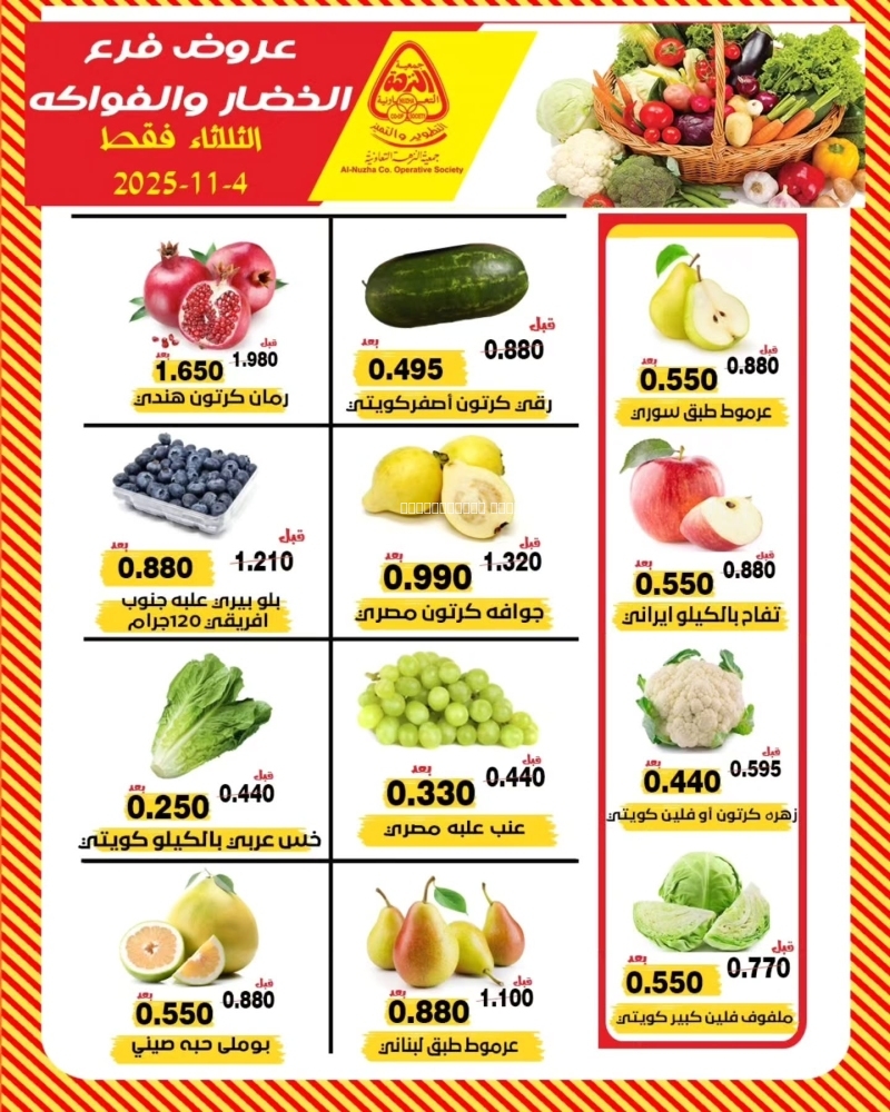 عروض جمعية النزهة التعاونية اليوم 4 نوفمبر 2025 الموافق 13 جمادى الاول 1447 عروض الخضار و الفواكه . تابعوا أحدث عروض السعودية المتوفرة في جميع المتاجر و الهايبرات بأسعار منافسة 4-11-2025 الموافق 13-5-1447 عروض جمعية النزهة التعاونية اليوم : تتضمن تخفيضات جمعية النزهة التعاونية بينار بوريك رولز ٥٠٠ جم ٢ قطعة . و ايضا كذلك نواكر شرائح لحم بقري ٩٠٠ جرام . لا ننسى ايضا كذلك نات جريل دجاج ٨٠٠ جرام ٢ قطعة . و يوجد هنا كذلك روساري ناجتس دجاج ٧٥٠ جرام . كما و لدينا ايضا كذلك صابون انشانتر ٣ حبة ١٢٥ جرام . و لا تنسوا ايضا كذلك مسحوق غسيل الملابس سرف ١,٤ كيلو جرام . منعم اقمشة وي تو ٢ لتر . ترقبوا كذلك المزيد من العروض و المفاجات في كل أسبوع . عروض جمعية النزهة التعاونية لهذا الأسبوع: و مما تقدمه لكم أيضاً عروض اليوم من عروض الجيزاوي دقيق ١ كيلو جرام . و ايضا كذلك البوادي طحينة ٤٨٠ جرام و هارفست خل ١ لتر . لا ننسى ايضا كذلك ريحانة عدس اصفر ٥٠٠ جرام . و يوجد هنا كذلك شهد سكر ابيض ١ كيلو جرام . كما و لدينا ايضا كذلك عبور لاند جبنة سبريد انواع مختلفة ٥٠٠ جم . و لا تنسوا ايضا كذلك دانيت كريم كراميل او فراولة ٧٥ جرام . واليكم الصور الآتية على موقع عروض الكويت