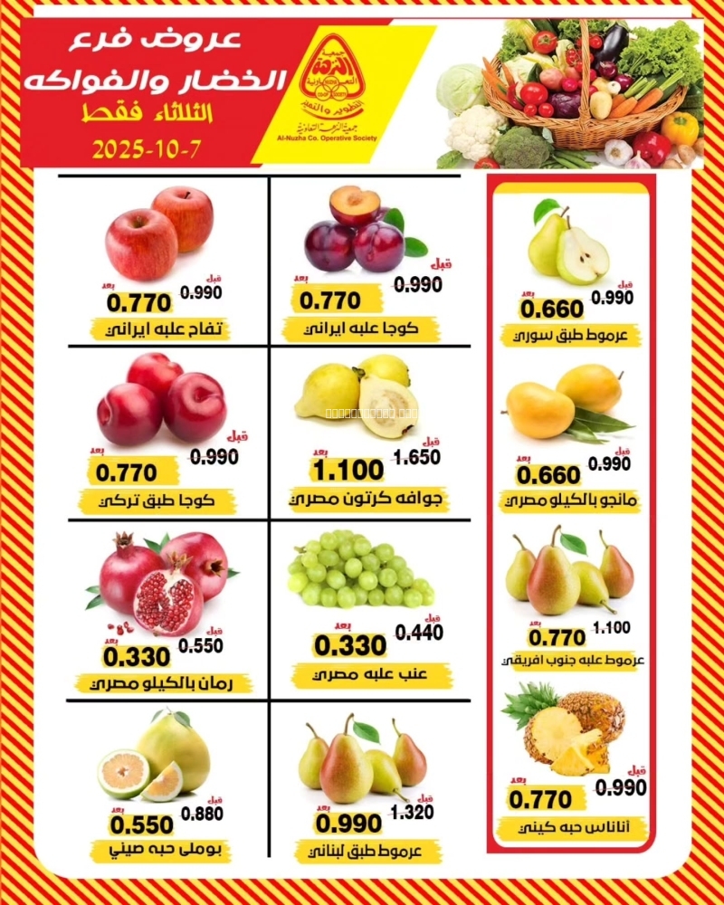 عروض جمعية النزهة التعاونية اليوم 7 أكتوبر 2025 الموافق 14 ربيع الاخر 1447 عروض الخضار و الفواكه