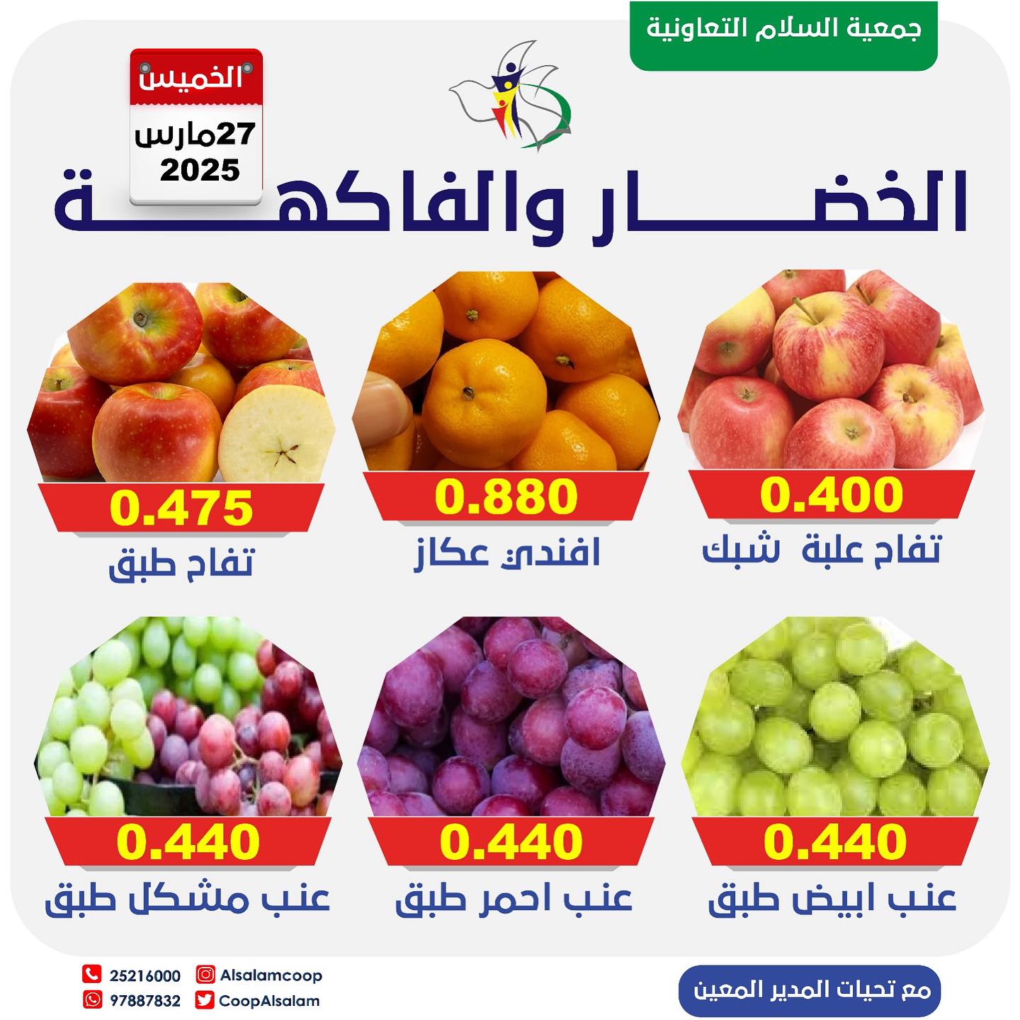 عروض جمعية السلام التعاونية اليوم 27 مارس 2025 الموافق 27 رمضان 1446 عروض الخضار و الفواكه بصفحة واحدة