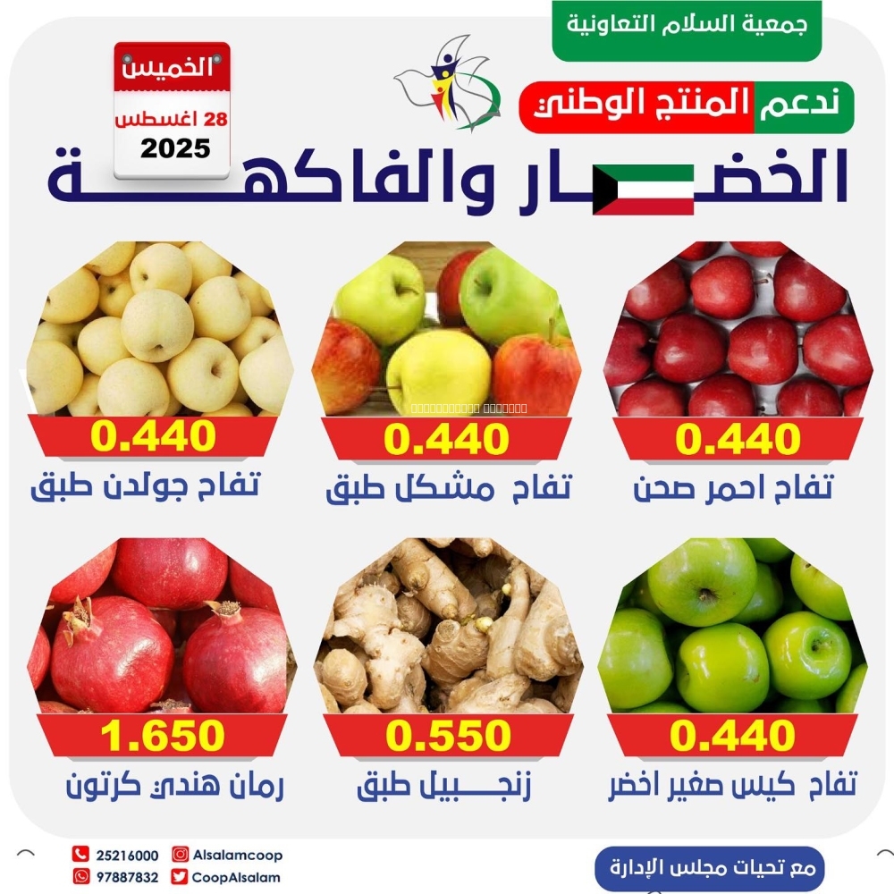عروض جمعية السلام التعاونية اليوم 26 سبتمبر 2024 الموافق 23 ربيع الاول 1446 عروض الخضار و الفواكه بصفحة واحدة
