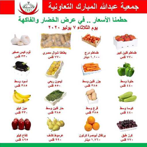 عروض جمعية عبد الله المبارك حطمنا الاسعار 6/7/2020 الموافق 15 ذو القعدة 1441 عروض تحطيم الاسعار في عروض الخضار والفاكه الطازجة دوما هذه العروض ليوم واحد الثلاثاء 7/7/2020