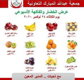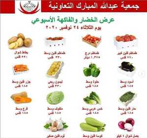 عروض جمعية عبد الله المبارك التعاونية الكويت الثلاثاء 24/11/2020 الموافق 9 ربيع الثاني 1442 عرض الخضار والفاكهة الاسبوعية ليوم الثلاثاء 24 نوفمبر 2020 مجموعة من الخضار والفاكهة الطازجة