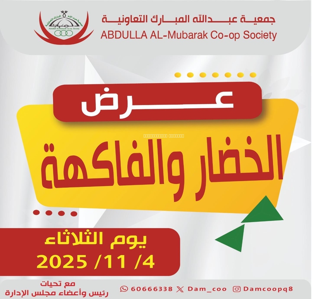عروض جمعية عبد الله المبارك التعاونية اليوم 4 نوفمبر 2025 الموافق 13 جمادى الاول 1447 عروض الخضار و الفواكه