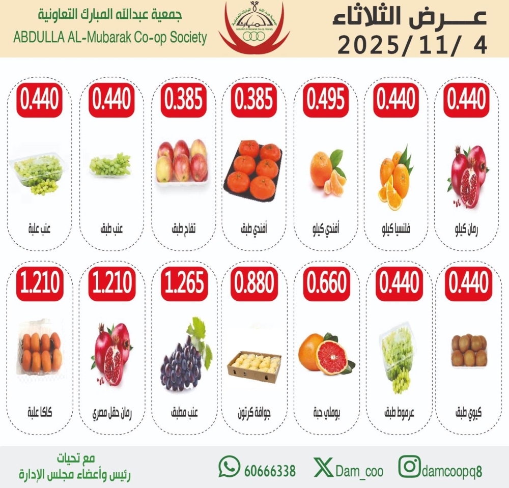 عروض جمعية عبد الله المبارك التعاونية اليوم 4 نوفمبر 2025 الموافق 13 جمادى الاول 1447 عروض الخضار و الفواكه . تابعوا أحدث عروض السعودية المتوفرة في جميع المتاجر و الهايبرات بأسعار منافسة 4-11-2025 الموافق 13-5-1447 عروض جمعية عبد الله المبارك التعاونية اليوم : تتضمن تخفيضات جمعية عبد الله المبارك التعاونية سدرا تمر مجدول ١ كيلو جرام . و ايضا كذلك توت الديوان فاكهة كورديال ٧١٠ مل . لا ننسى ايضا كذلك أمريكان شرائح بطاطس خاصة ١٧٠ جرام ٢ حبة . و يوجد هنا كذلك نسكافيه كلاسيك اصلي ٢٠٠ جرام . كما و لدينا ايضا كذلك راين بو حليب ٢,٢٥ كيلو غرام . و لا تنسوا ايضا كذلك رول لابيل مسحوق شاي متوسط ٥٠٠ جرام . ترقبوا كذلك المزيد من العروض و المفاجات في كل أسبوع . عروض جمعية عبد الله المبارك التعاونية لهذا الأسبوع: و مما تقدمه لكم أيضاً عروض اليوم من عروض بيكي بيكر توست سادة او بالحليب او الردة ٥٠٠ جم . و ايضا كذلك اندومي نودلز انواع مختلفة جامبو ١٠٠ جرام . لا ننسى ايضا كذلك تيميز فروت رينجز او شوكو سكوبس ٢٥٠ جم . و يوجد هنا كذلك لوكس بسكويت بالتمر ١٢ حبة . كما و لدينا ايضا كذلك كوكو لافرز سندويش شوكولاتة او كريمة مالتي باك ٥ قطعة و ١ قطعة مجانا . و لا تنسوا ايضا كذلك لايون شيبسي انواع مختلفة ٧٤ جم . واليكم الصور الآتية على موقع عروض الكويت