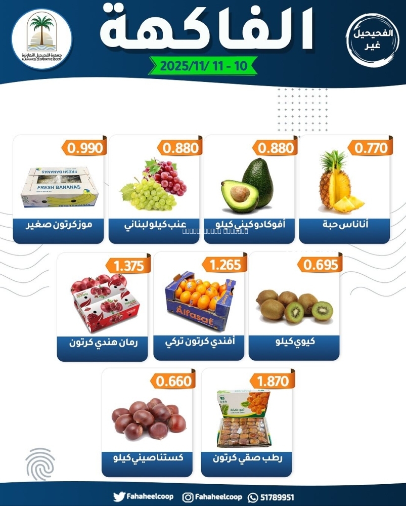 عروض جمعية الفحيحيل التعاونية اليوم 10 نوفمبر 2025 الموافق 19 جمادى الاول 1447 عروض الخضار و الفواكه