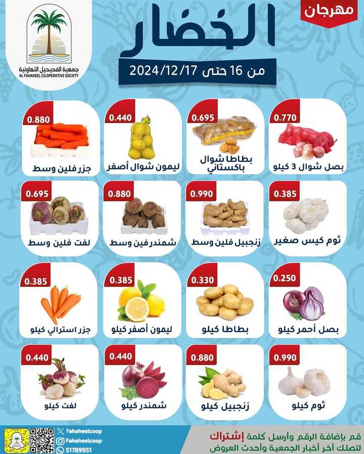 عروض جمعية الفحيحيل التعاونية اليوم 16 ديسمبر 2024 الموافق 15 جمادى الاخر 1446 عروض الخضار و الفواكه بصفحة واحدة