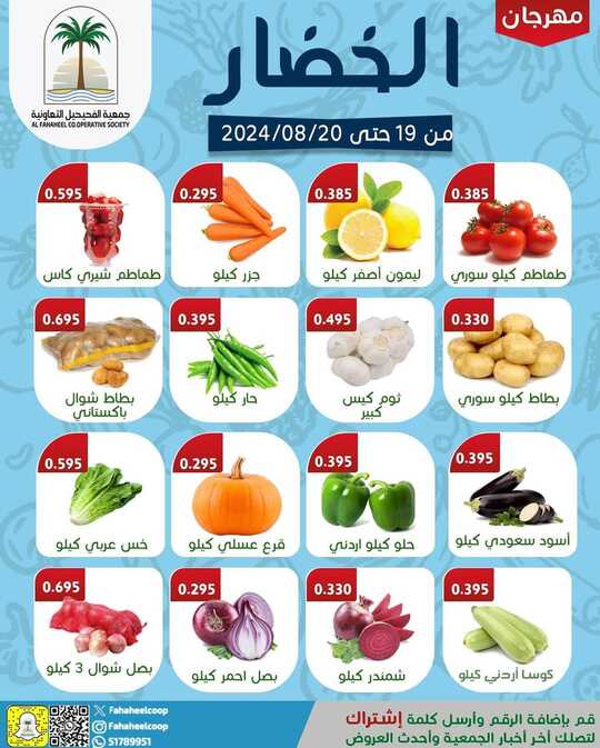 عروض جمعية الفحيحيل التعاونية اليوم 19 أغسطس 2024 الموافق 15 صفر 1446 عروض الخضار و الفواكه بصفحة واحدة . تابعوا أحدث عروض اليوم 19-8-2024 الموافق 15-2-1446
