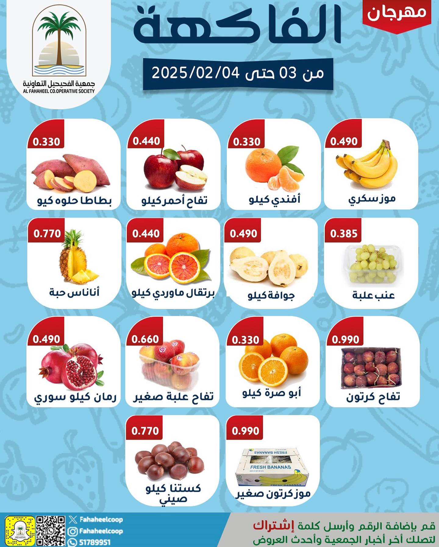 عروض جمعية الفحيحيل التعاونية اليوم 3 فبراير 2025 الموافق 4 شعبان 1446 عروض الخضار و الفواكه بصفحة واحد . تابعوا أحدث عروض السعودية المتوفرة في جميع المتاجر و الهايبرات بأسعار منافسة 3-2-2025 الموافق 4-8-1446