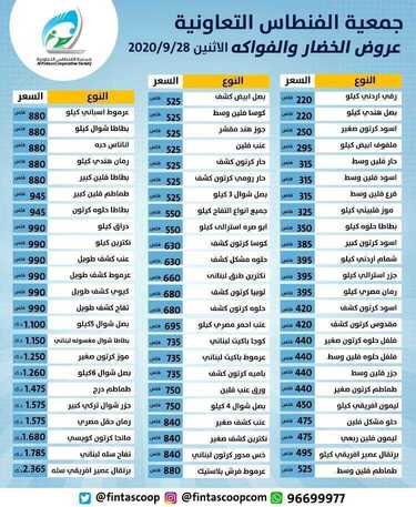 عروض جمعية الفنطاس التعاونية الكويت الاثنين 28/9/2020 الموافق 11 صفر 1442 عروض الخضار والفواكه ليوم الاثنين تشكيلة من الخضار والفاكهة والطازجة
