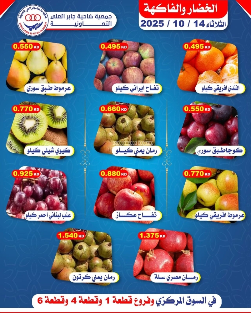 عروض جمعية جابر العلي التعاونية اليوم 14 أكتوبر 2025 الموافق 21 ربيع الاخر 1447 عروض الخضار و الفواكه