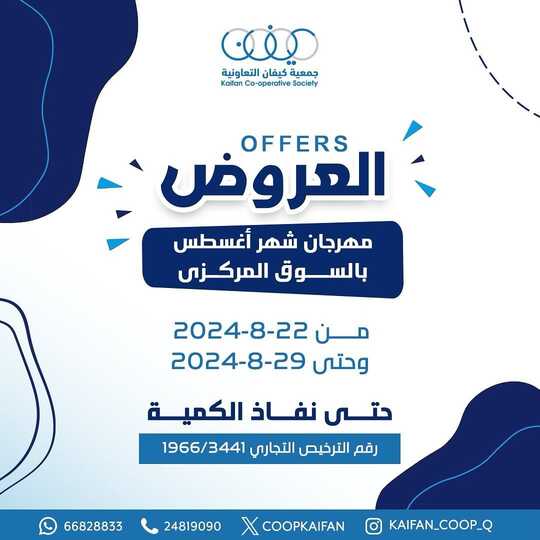عروض جمعية كيفان التعاونية اليوم 22 أغسطس 2024 الموافق 18 صفر 1446 عروض مهرجان شهر أغسطس بصفحة واحدة . تابعوا أحدث عروض اليوم 22-8-2024 الموافق 18-2-1446