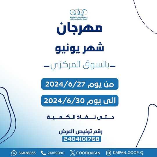 عروض جمعية كيفان التعاونية اليوم 24 يونيو 2024 الموافق 18 ذو الحجة 1445 عروض مهرجان يونيو بصفحة واحدة . تابعوا أحدث عروض اليوم 24-6-2024 الموافق 18-12-1445