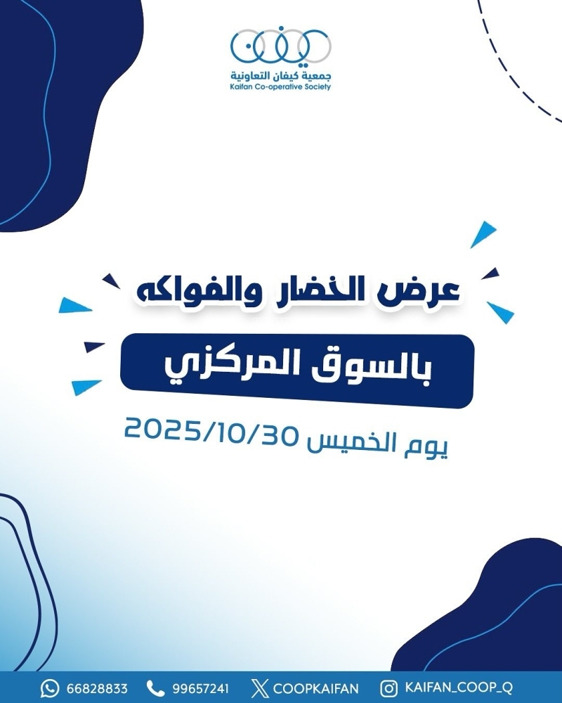 عروض جمعية كيفان التعاونية اليوم 30 أكتوبر 2025 الموافق 8 جمادى الاول 1447 عروض الخضار و الفواكه