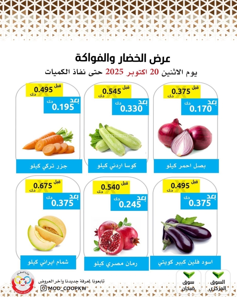 عروض جمعية وزارة الدفاع الاستهلاكية اليوم 20 أكتوبر 2025 الموافق 28 ربيع الاخر 1447 عروض الخضار و الفواكه