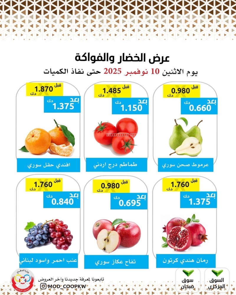 عروض جمعية وزارة الدفاع الاستهلاكية اليوم 29 سبتمبر 2025 الموافق 6 ربيع الاخر 1447 عروض الخضار و الفواكه