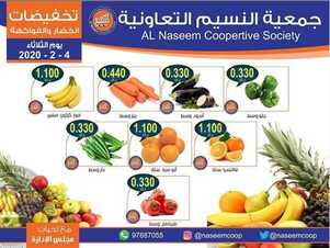 عروض جمعية النسيم التعاونية الثلاثاء 4/2/2020 الموافق 10 جمادى الثانية 1441 عروض للخضار والفواكه من جمعية النسيم التعاونية ليوم الثلاثاء تشكيلة منوعة من الخضار والفواكه الطازجة