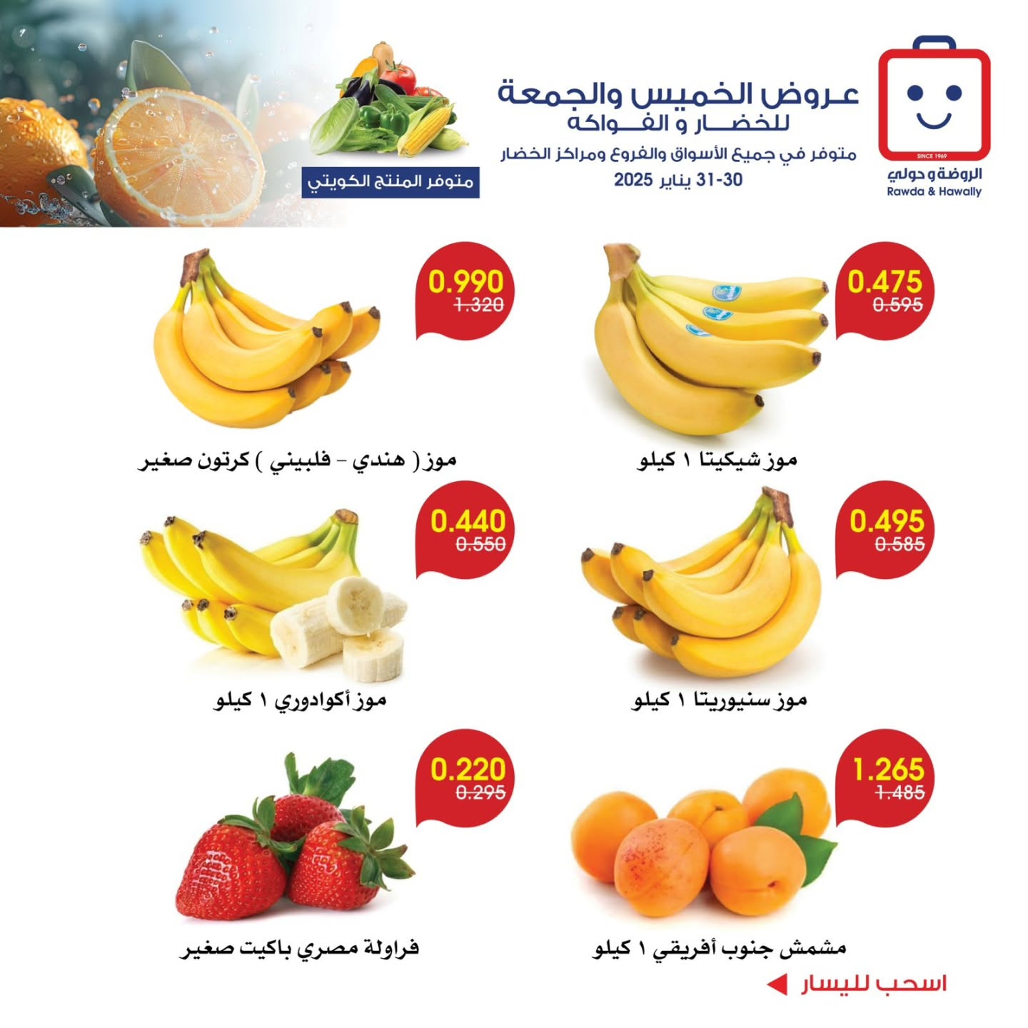 عروض جمعية الروضة و حولي التعاونية اليوم 30 يناير 2025 الموافق 30 رجب 1446 عروض الخضار و الفواكه بصفحة واحدة . تابعوا أحدث عروض السعودية المتوفرة في جميع المتاجر و الهايبرات بأسعار منافسة 30-1-2025 الموافق 30-7-1446
