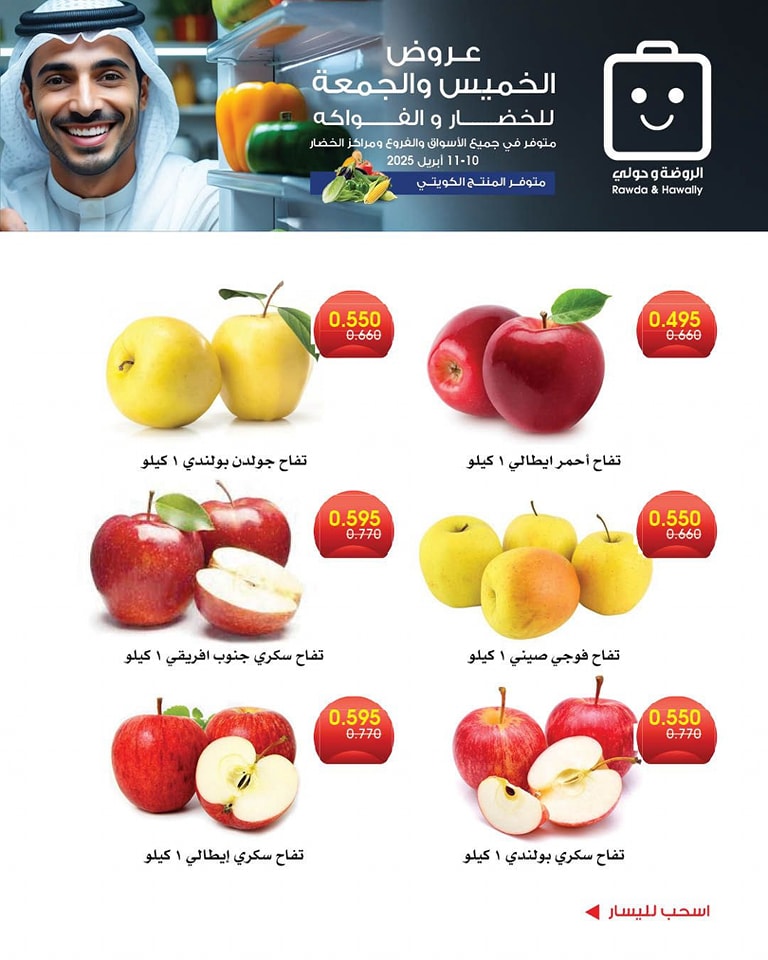 عروض جمعية الروضة و حولي التعاونية اليوم 10 أبريل 2025 الموافق 11 شوال 1446 عروض الخضار و الفواكه بصفحة واحدة