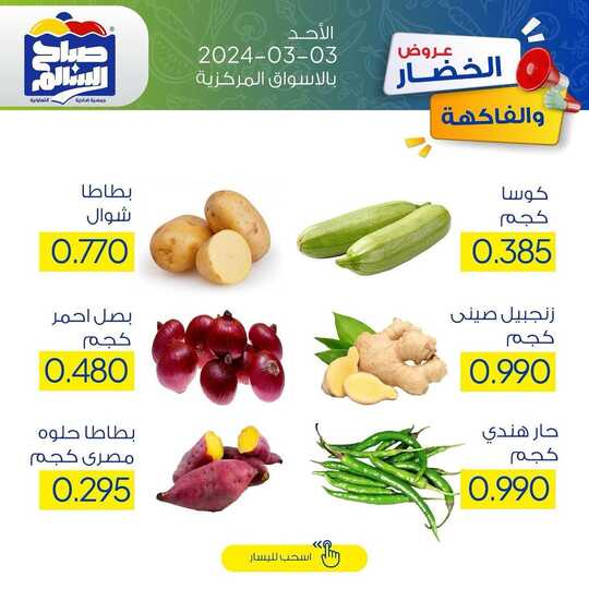 عروض جمعية صباح السالم التعاونية اليوم 3 مارس 2024 الموافق 22 شعبان 1445 عروض الخضار والفاكهة بصفحة واحدة . تابعوا أحدث عروض اليوم 3-3-2024 الموافق 22-8-1445