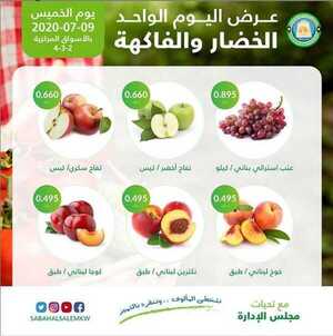 عروض جمعية صباح السالم الكويت الخميس 9/7/2020 الموافق 18 ذو القعدة 1441 عروض اليوم الواحد الخضار والفاكهة الخميس 9 يوليو 2020 خضروات وفواكه طازجة ومنوعة