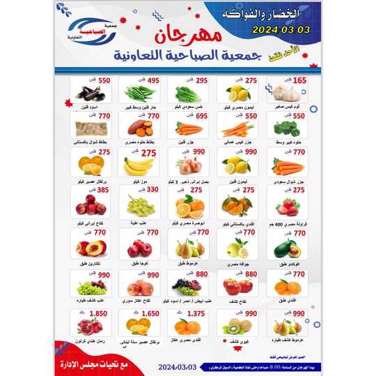 عروض جمعية الصباحية التعاونية لشهر مارس اليوم 3 مارس 2024 الموافق 23 شعبان 1445 مهرجان الخضار بصفحة واحدة