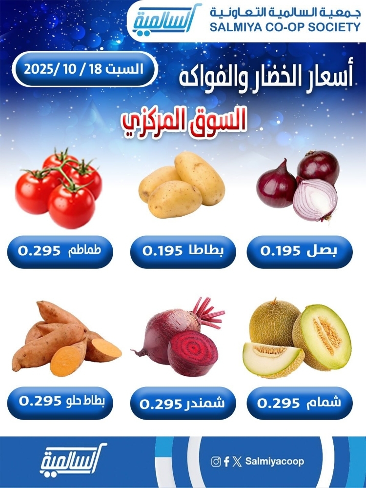 عروض جمعية السالمية التعاونية اليوم 18 أكتوبر 2025 الموافق 25 ربيع الاخر 1447 عروض الخضار و الفواكه