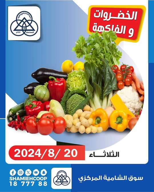 عروض جمعية الشامية و الشويخ التعاونية اليوم 20 أغسطس 2024 الموافق 16 صفر 1446 عروض الخضار و الفواكه بصفحة واحدة . تابعوا أحدث عروض اليوم 20-8-2024 الموافق 16-2-1446