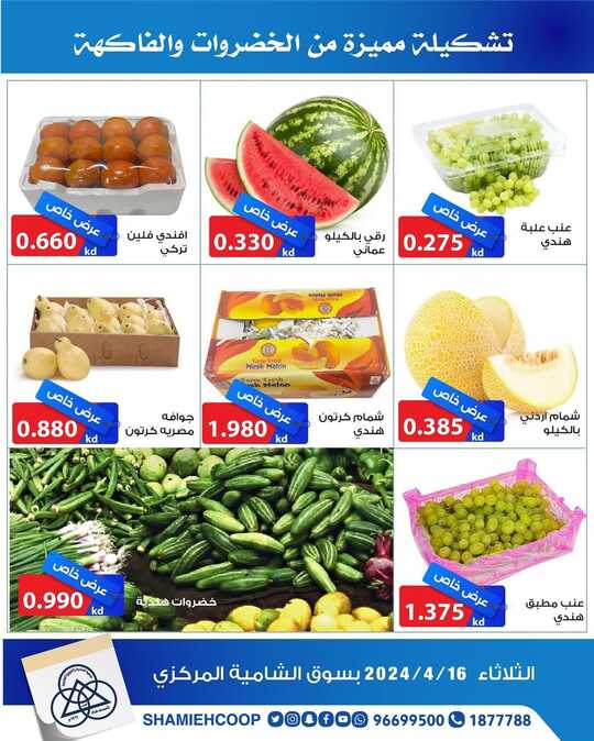عروض جمعية الشامية و الشويخ التعاونية اليوم 16 أبريل 2024 الموافق 7 شوال 1445 عروض الخضار والفاكهة بصفحة واحدة. تابعوا أحدث عروض اليوم 16-4-2024 الموافق 7-10-1445