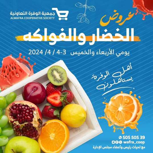 عروض جمعية الوفرة التعاونية اليوم 3 ابريل 2024 الموافق 24 رمضاان 1445 عروض الخضار والفاكهة بصفحة واحدة. تابعوا أحدث عروض اليوم 3-4-2024 الموافق 24-9-1445