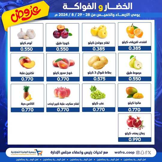 عروض جمعية الوفرة التعاونية اليوم 28 أغسطس 2024 الموافق 24 صفر 1446 عروض الخضار و الفواكه بصفحة واحدة . تابعوا أحدث عروض اليوم 28-8-2024 الموافق 24-2-1446