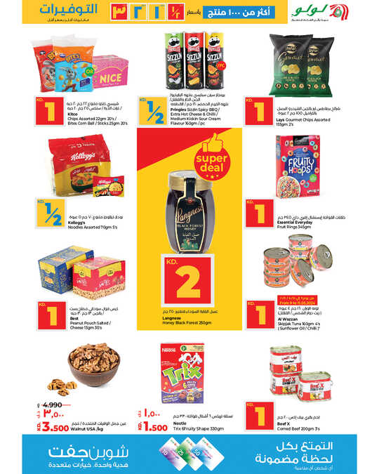 من بين العروض التوفيرية التي تقدمها تجدون كذلك كيو بي بي سمن نقي ٤٠٠ مل . و ايضا كذلك عرض هينز كاتشب الطماطم ٩١٠ غرام ٢ حبة . لا تفوتوا ايضا كذلك بلفيتا بسكويت منوع ٦٢ غرام ٢٤ قطعة . و ليس هذا فحسب ايضا كذلك بانزاني معكرونة منوعة ٤٠٠ غرام ٣ حبات او ٢٠٠ غرام ٤ حبات . لا تنسوا ايضا كذلك ابو قوس حليب مجفف ٢,٢٥ كيلو جرام . و كما و لدينا ايضا كذلك عرض البلد سكر ابيض ٥ كيلو جرام .