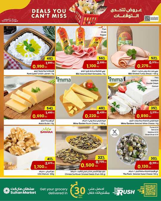 تتضمن تخفيضات ايضا يوجد من ضمن عروضنا جبنة رومي زينة . كما يوجد جبنة فيتا دانماركي . كذلك يوجد جبنة مثلثات أبو الولد . ايضا يوجد من ضمن عروضنا زيت الزيتون المكرر الباشا. كما يوجدمن ضمن عروضنا الوفاء زيت دوار الشمس . كذلك يوجد من ضمن عروضنا الوفاء سكر ناعم ابيض . ايضا يوجد المجلس سكر ناعم ابيض . كذلك يوجد برغل ناعم أو خشن المهباج . ايضا يوجد من ضمن عروضنا سميد خشن المبهاج . كما يوجد من ضمن عروضنا عدس احمر او بني مهباج . كذلك يوجد من ضمن عروضنا عدس ماش أخضر . ترقبوا المزيد من العروض والمفاجات في كل أسبوع.